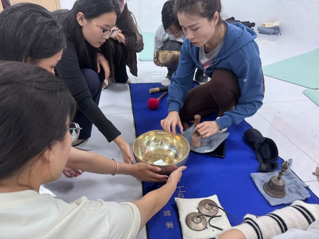体验结束后,同学们怀着浓厚的兴趣围住老师,积极探讨颂钵疗愈的原理。现场互动让这份宁静体验有了更扎实的理论注解。